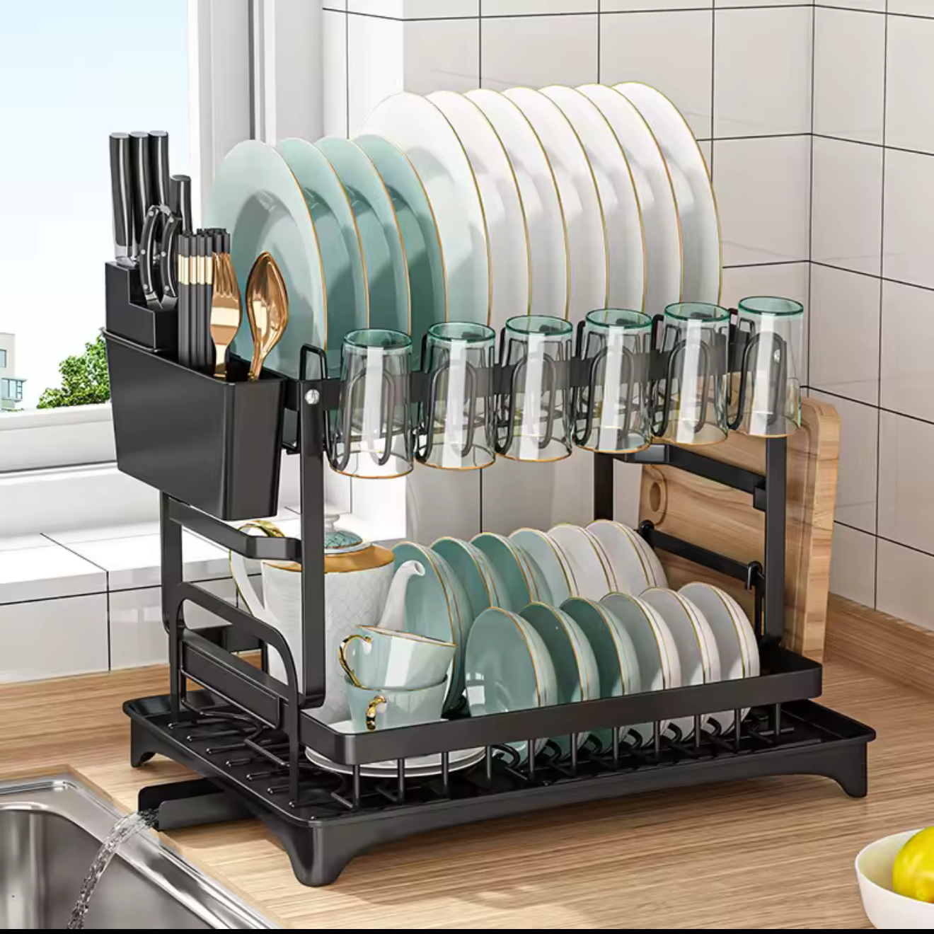 Păstrează-ți bucătăria ordonată și eficientă cu acest suport de vase practic și elegant. Construit din metal rezistent, suportul dispune de două niveluri spațioase pentru farfurii, boluri și pahare, precum și suport lateral pentru tacâmuri, cuțite și tocător. Include tăvi de scurgere detașabile pentru o curățare ușoară și o suprafață mereu uscată. Designul modern, în negru mat, se potrivește perfect în orice bucătărie.