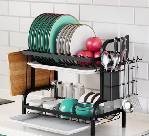 Păstrează-ți bucătăria ordonată și eficientă cu acest suport de vase practic și elegant. Construit din metal rezistent, suportul dispune de două niveluri spațioase pentru farfurii, boluri și pahare, precum și suport lateral pentru tacâmuri, cuțite și tocător. Include tăvi de scurgere detașabile pentru o curățare ușoară și o suprafață mereu uscată. Designul modern, în negru mat, se potrivește perfect în orice bucătărie.